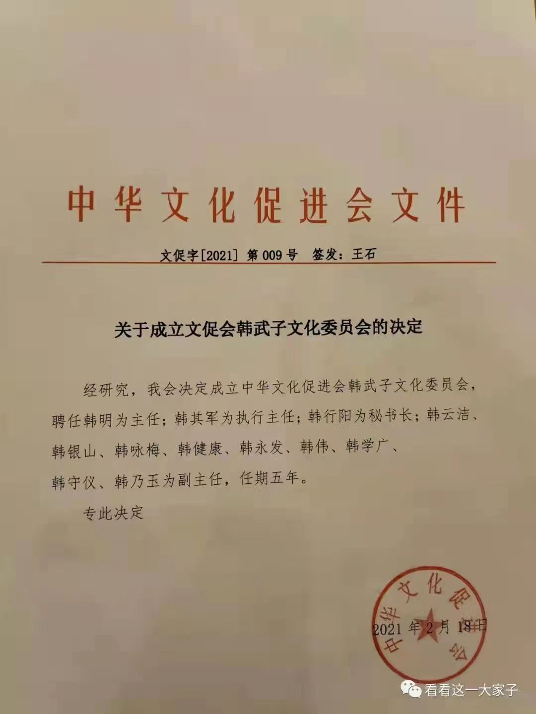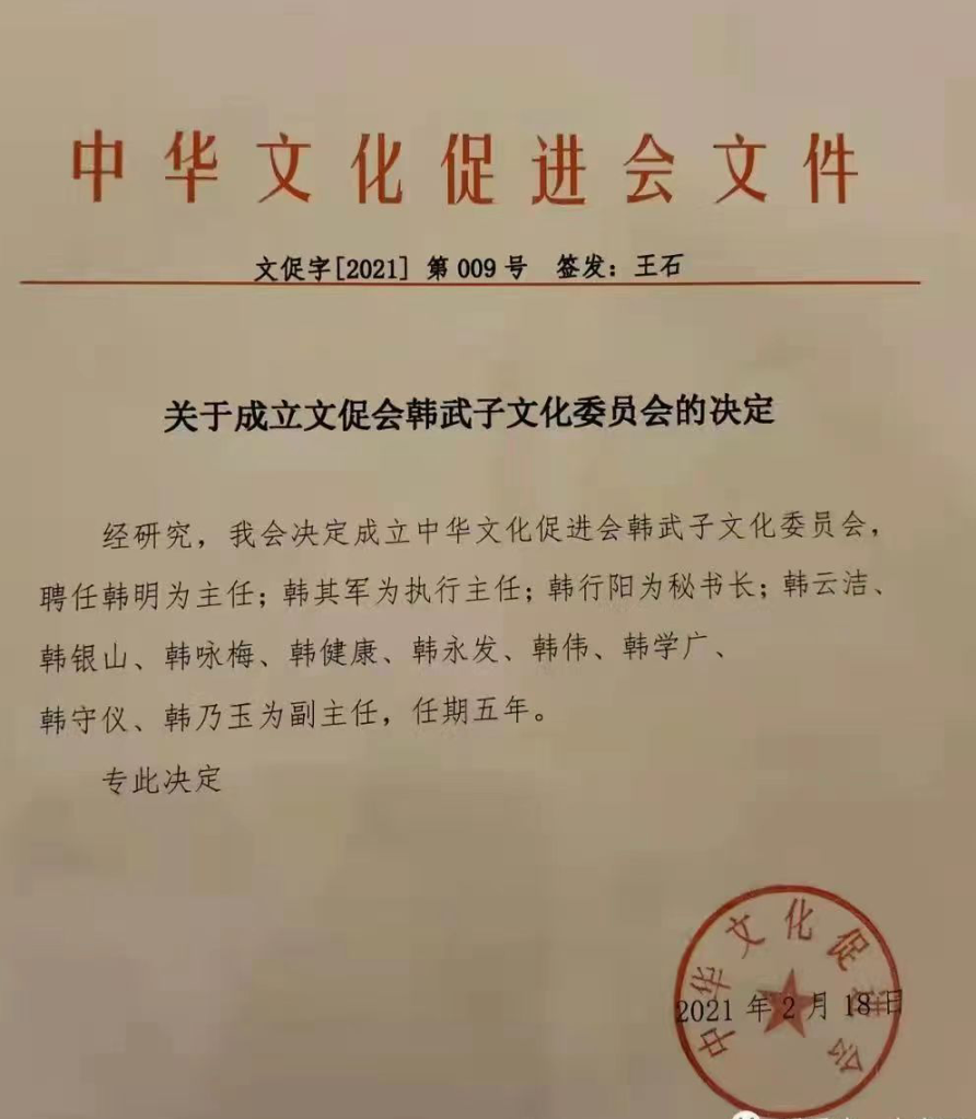 文促字[2021]第009号文件 关于成立文促会韩武子文化委员会的决定