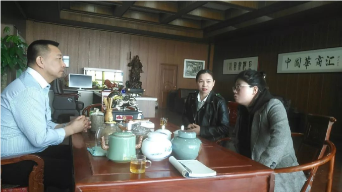 接待福建商人颜丽群(中)及合作伙伴沙黎明(右一)