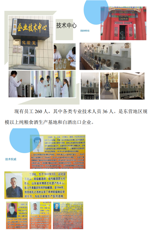 2 企业建有技术中心、白酒文化艺术馆、地下酒窖和酒器博物馆。 3 现有员工 260 人,其中各类专业技术人员 36 人。是东营地区规 模以上纯粮食酒生产基地和白酒出口企业。